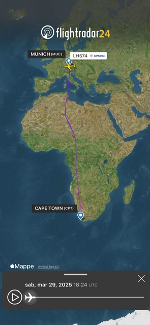 L’aereo, un A340-300 marche D-AIGM della Lufthansa decolla da Francoforte come LH576 alle 21:48 e arrivato a Cape Town alle 9:54 e undici ore e sette minuti di volo.