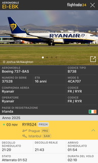 L’altra notte, questo Boeing 737-800 con le marche EI-EBK della compagnia aerea irlandese low cost Ryanair e’ stato trasferito da Praga a Istanbul Sabiha Gokcen come FR524.