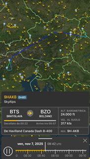 Nella mattinata di venerdi a Bolzano é arrivato un DHC-8-Q400 con le marche 9H-AKB e secondo Flightradar24 e’ riportato come SkyAlps.