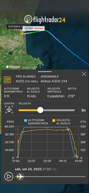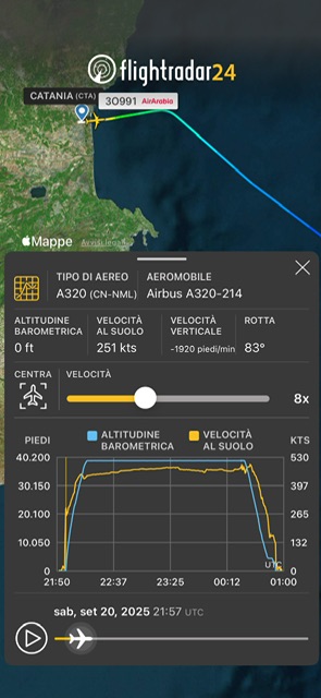Qualche settimana fà, per la precisione a tarda sera del 20 settembre 2025, un Airbus 320-214 Air Arabia con registrazione CN-NML parte alle 23:56 locali da Catania con destinazione Amman per attivitá manutentive programmate. Vi rimarrà fino al 10 ottobre successivo.