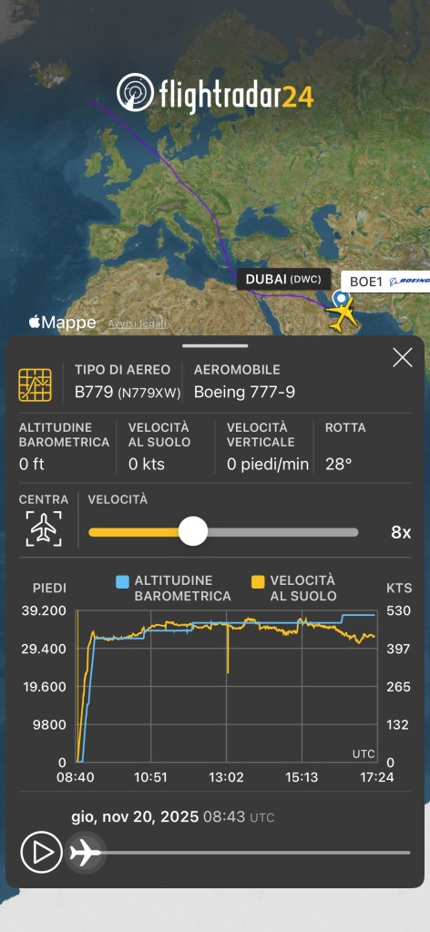 Alle 8:52 UTC di oggi e’ decollato come BOE001da Dubai World Central dove ha partecipato al Dubai Airshow e ha sorvolato il Golfo Persico, Arabia Saudita, Egitto, Grecia , Bulgaria, Romania, Ungheria, Slovacchia, Cechia, Germania, Danimarca, Islanda. Quindi Groenlandia, Canada e USA.