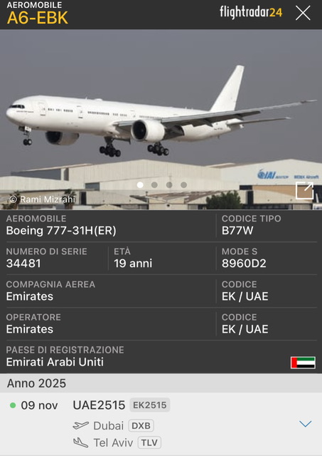 Il 9 novembre scorso come UAE/EK2515 il Boeing 777-31H ER A6-EBK ha lasciato Dubai per Tel Aviv. L’aereo come si vede nella foto era già privo di titoli e scritte del vettore emiratino. L’ultimo volo commerciale e’ stato il 28 ottobre da Colombo a Dubai. L’aereo ha 19 anni di vita ed era configurato F8C42Y310. Nei 12 giorni di fermo macchina oltre alla rimozione di titoli e scritte , avra’ visto il completo strip degli interni, tutti materiali utili oer essere messi a magazzino e riutilizzati come parti di ricambio.