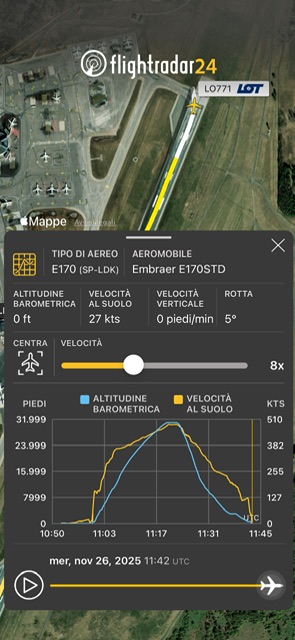 Il decollo del volo LO771 e’ stato alle 12 con 5 minuti di ritardo sull’orario previsto. Tutto regolare in salita, crociera e discesa. A Vilnius atterra alle 13:42 dopo 42 minuti di volo per pista 01 e la percorre tutta, poi nel virare oppure per qualche altra concausa ha finito la corsa nel prato a fianco tra la congiunzione della pista con il raccordo. Nessun problema per chi era a bordo.