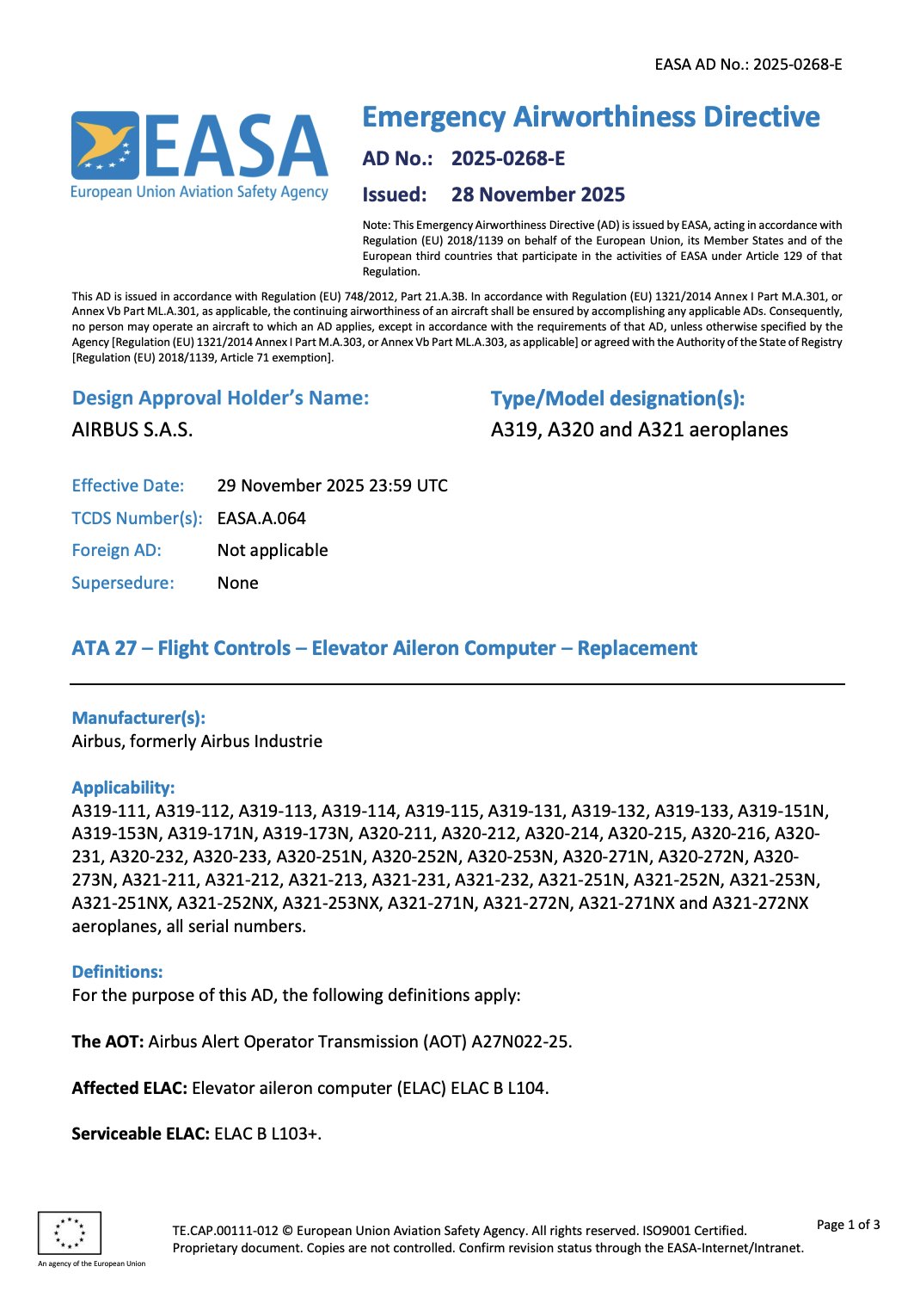 Airbus ha collaborato proattivamente con le autorità aeronautiche per richiedere agli operatori misure precauzionali immediate tramite una Alert Operators Trasmission (AOT) al fine di implementare le protezioni software e/o hardware disponibili e garantire la sicurezza della flotta. Questa AOT sarà recepita in una Emergency Airworthiness Directive dell’Agenzia Europea per la Sicurezza Aerea (EASA).