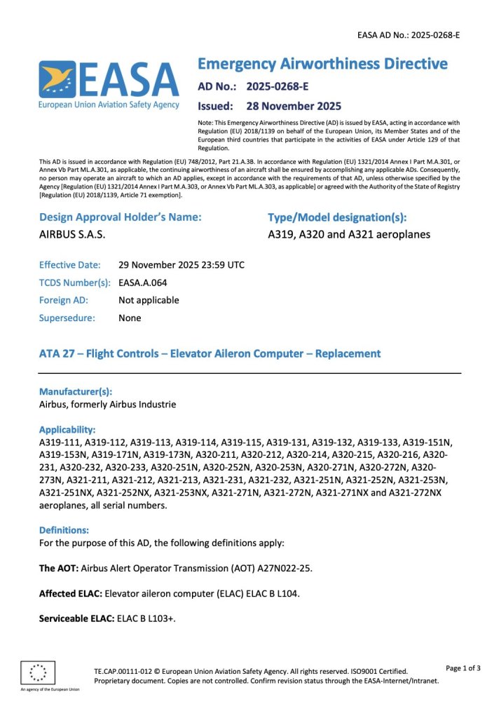 Airbus riconosce che queste raccomandazioni causeranno interruzioni operative per passeggeri e clienti. Ci scusiamo per l’inconveniente causato e collaboreremo a stretto contatto con gli operatori, mantenendo la sicurezza come priorità assoluta e prioritaria.