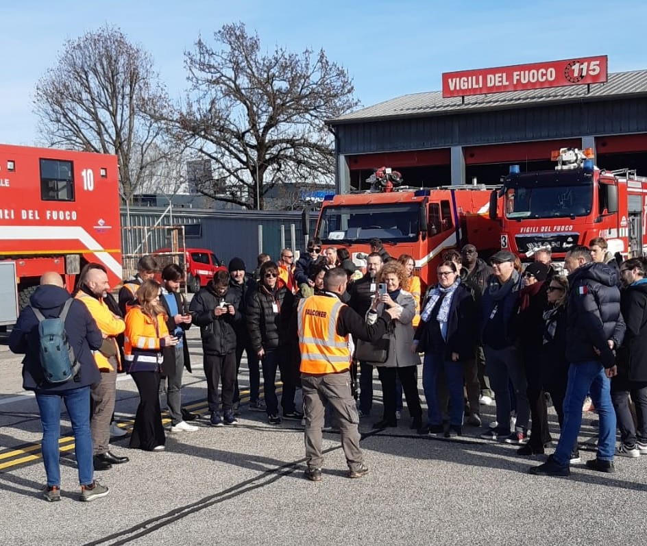All’aeroporto Marco Polo di Venezia, dopo una presentazione generale, gli ospiti sono stati accompagnati in una visita immersiva nell’affascinante contesto lagunare, con un racconto a tappe fatto di conoscenza ed esperienza diretta, che ha restituito la specificità dello scalo ubicato tra acqua e terra e che, come tale, richiede attente e costanti attività di controllo e tutela ambientale. Raggiunta a bordo di un autobus interpista la fascia stradale interna che costeggia la laguna, atterraggi e decolli sono stati osservati da un’inedita prospettiva ravvicinata, con sullo sfondo il terminal passeggeri e, a lato, il nuovo ampliamento in fase di realizzazione. Da qui l’incontro con l’unità di controllo di SAVE specializzata nell’utilizzo dei falconi per la sicurezza dei voli, una tecnica antica e nel contempo di elevata efficacia. Sosta successiva, il presidio dei Vigili del Fuoco che, con consueta generosità, hanno illustrato le caratteristiche degli automezzi in dotazione, dimostrandone l’utilizzo con particolare entusiasmo per gli ospiti più piccoli che sono stati fatti salire nella cabina di guida.