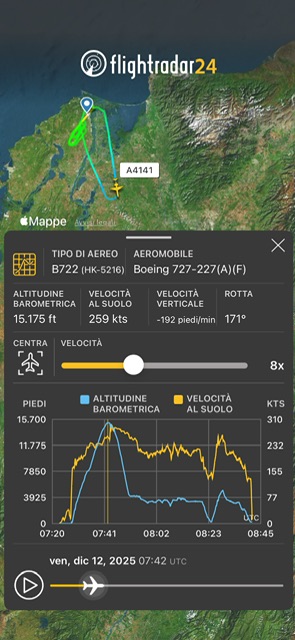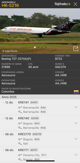 L’aereo ha volato regolarmente fino al 6 dicembre, quando a Bogotà è giunto da Panama City. Il successivo volo A42170 vede l’interruzione del decollo.