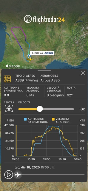 Questo aereo ha volato ieri per 94 minuti dalle 13:12 alle 14:46 come AIB02CU. Il precedente era stato il 1 dicembre 2025.