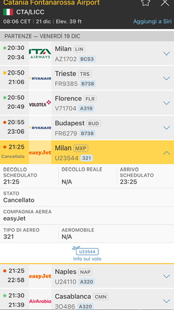 Sia Qds.it, , che Sicilia in Volo su Facebook hanno segnalato l’avvenuta cancellazione nella serata di venerdì 19 dicembre di una coppia di voli easyJet da Milano Malpensa per Catania e ritorno. Il risultato finale è stato che chi era prenotato non ha potuto volare verso la destinazione del biglietto nelle loro mani.