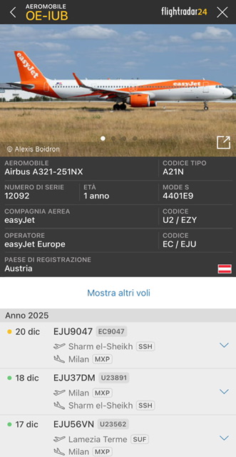 Parte da Milano Malpensa il 18 dicembre alle 7:51 e arriva alle 12:30 a Sharm el Sheikh. Rientra il 20 dicembre alle 14:49 ora di partenza da SSH come EC9047 e arriva alle 18:05.
