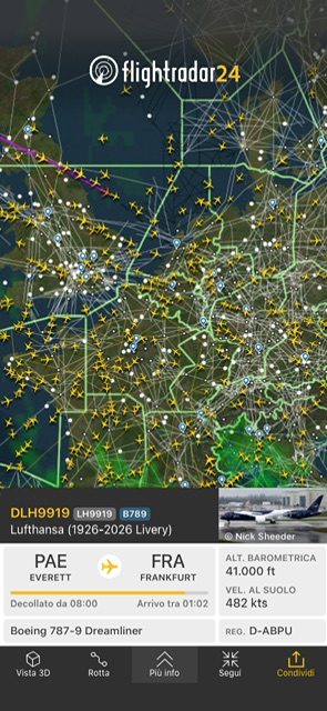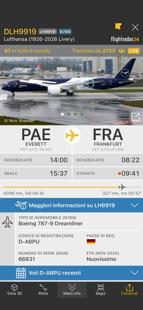 Il decollo del volo LH9919 da Seattle Paine Field è avvenuto alle 15:37 locali di ieri, ovvero le 00:37 di stamani in Europa a Francoforte. Alle 9:41 di oggi poserà le sue ruote all’aeroporto di Francoforte.