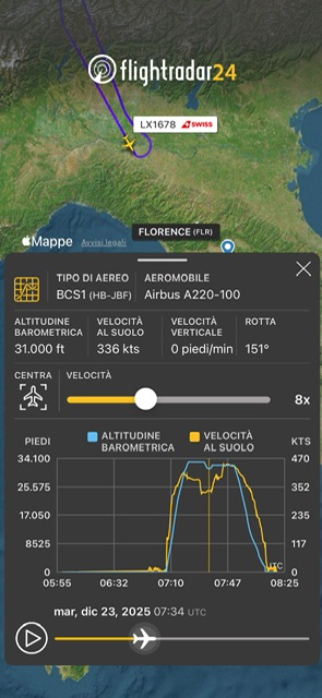 LX1678 Zurigo rit. a Zurigo. Da FL330 aveva iniziato la discesa ma a FL310 ha fermato tutto e a sud di Piacenza ha invertito la prua ritornando verso Zurigo e poi sale a FL320.