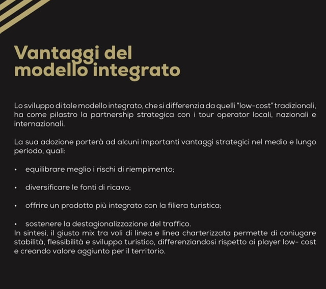 Il valore aggiunto al territorio si crea con il giusto mic tra operazioni di libea e quelle con allotmet turistici sugli stessi voli. Diversamente dalle politiche del classico lowcost.
