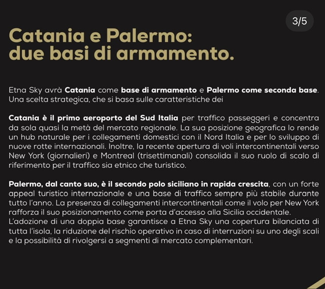 Perchè Etna Sky ha scelto di aprire in primis la base di armamento a Catania e l’altra base su Palermo. Due aeroporti leggermebti diversi per posizionamento geografico ed economico. Catania leggermente prevalente rispetto a Palermo. Ma alla fine perfettamente complementari per le diverse economieche vi gravitano.