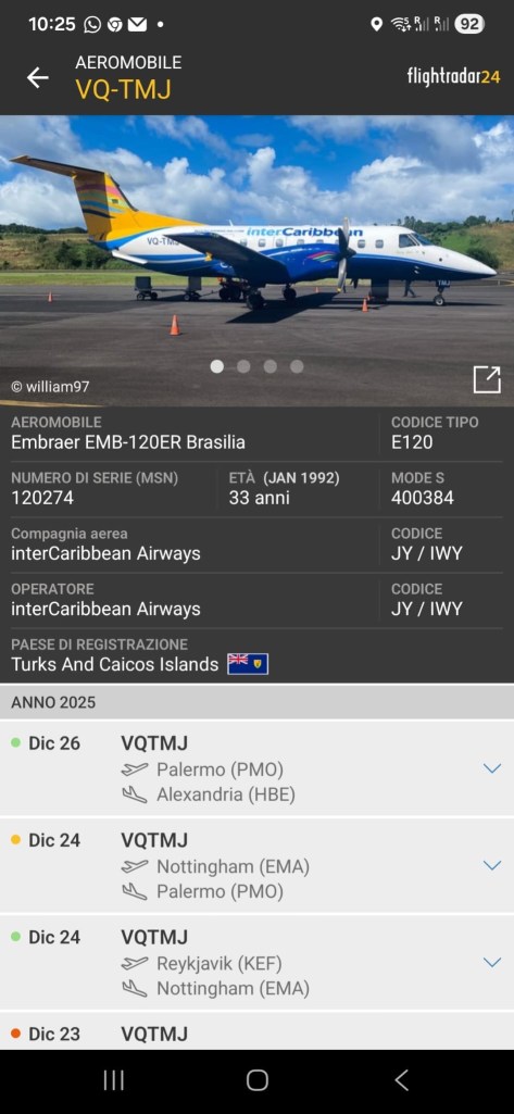 Non ha destato scalpore la sosta a Palermo di un Embraer 120 Brasilia, un commuter molto noto tra gli anni ’80 e ’90, arrivato il 24 dicembre alle 21:29 e ha sostato tutto il giorno di Natale , il 25 dicembre ed è ripartito ieri mattina 26 dicembre alle 6:04. L’aereo ha le marche VQ-TMJ.