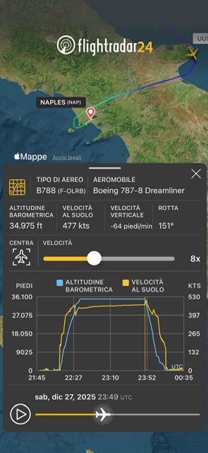 In questa immagine abbiamo immortalato il momento nel quale alle 00:49 ha invertito la rotta verso Napoli ad una mezzoretta di distanza, ha lasciato FL350.