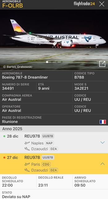 Questo aereo dalla coloratissima coda è fermo a Napoli dall’1:14 di oggi. È un Boeing 787-8 Dreamliner F-OLRB di Air Austral che una volta a settimana sorvola il nostro Paese sulla via da Parigi CDG a Dzaoudzi nell’isola di Mayotte. Questa notte , invece ha invertito la rotta dal Gargano verso Napoli.