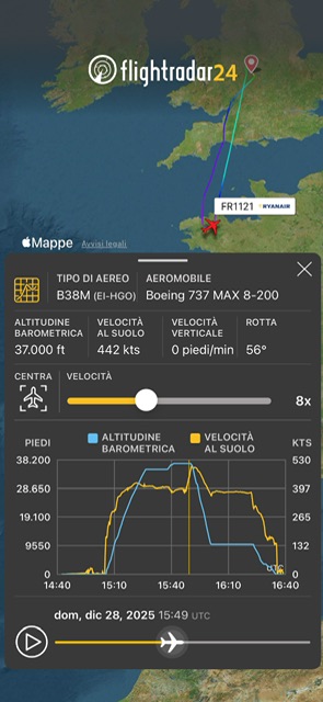 Un B737-8200 Ryanair con marche EI-HGO è decollato come FR1121 da Birmingham alle 15:05 , ma alle 15:46 sulla Bretagna a 30 miglia da Brest ha forzato al ritorno all’aeroporto di partenza. Tre minuti dopo ha inserito 7700 e ha iniziato la discesa da FL370 a FL100 che ha raggiunto alle 16. 35 minuti dopo e’ avvenuto l’atterraggio. I passeggeri hanno riportato che era in corso il servizio di bordo con i carrelli sul corridoio. L’aereo è ritornato in servizio questa mattina.
