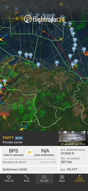 Guardando la traiettoria di questo grosso aereo executive brasiliano decollato da Porto Seguro, si vede lo spazio aereo del Venezuela completamente vuoto. Nessun aereo con ADSB acceso sta mostrando la sua posizione.