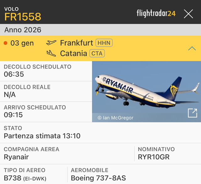 Sicilia in Volo riporta che il volo di stamani da Hahn a Catania della compagnia aerea lowcost irlandese Ryanair non è partito su segnalazione di una passeggera. L’aereo doveva decollaew alle 6:30 e giungere a Catania alle 9:15 con il velivolo B737-800 EI-DWK.