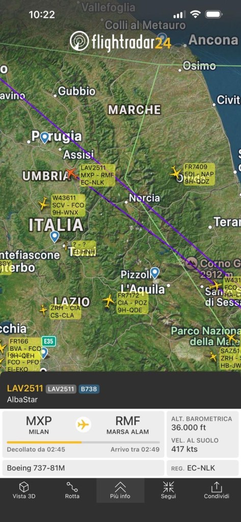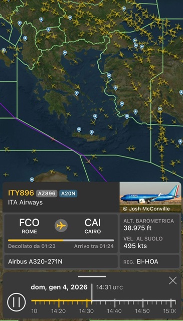 Il volo AZ896 da Roma a Cairo alle 15:31 ora italiana e 16:31 ora greca passa tramite un corridoio tra spazio aereo italiano, poi maltese, poi egiziano. Ma una mezz’oretta prima sono iniziati ad entrare nello spazio aereo greco.