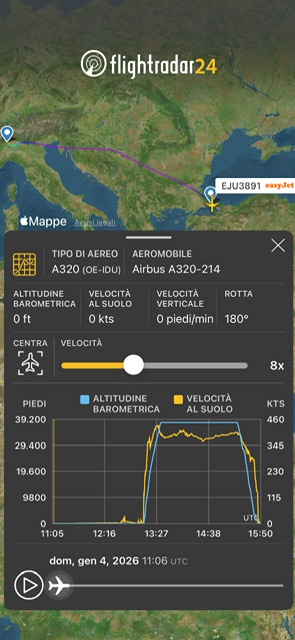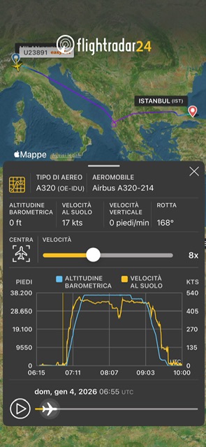 U23891 da Milano Malpensa alle 8:02 con A320-214 OE-IDU e atterrato a Istanbul alle 12:37 e poi rientrato a Milano Malpensa come EJU3891. Partito alle 16:09 e atterrato alle 16:46. U23892 cancellato