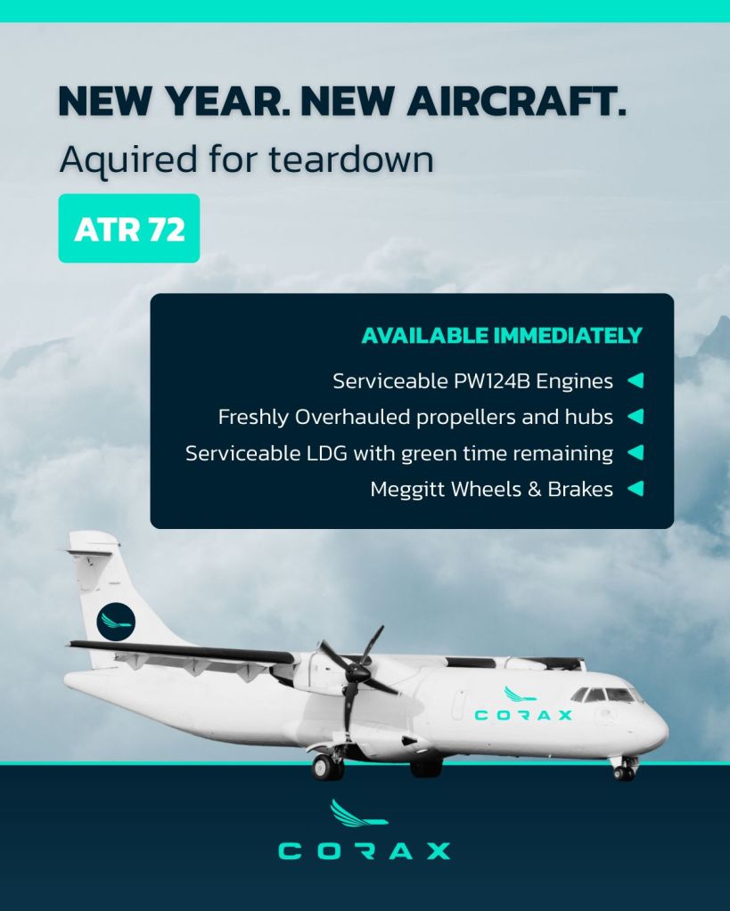 Corax annuncia oggi l’acquisizione di un ATR72 per lo smontaggio, ampliando ulteriormente il suo inventario di materiali di consumo e rafforzando il suo impegno a supportare la comunità globale degli operatori ATR.