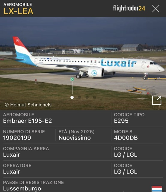 C’è solo l’Italia nel primo giorno di operazioni per il nuovissimo Embraer 195 E-2 della compagnia aerea lussemburghese Luxair.