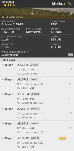 Quest’oggi compirà sei tratte il nuovo E195 E-2 con le marche LX-LEA. Prima Milano Malpensa, poi arriverà a Roma Fiumicino ed in serata nuovamente ritornerà a Milano Malpensa.