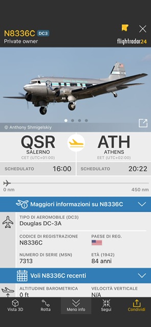 Quest’oggi alle 9:59 un Douglas DC-3A con le marche N8336C alla vendranda età di 84 anni ha volato per poco più di un’ora in un memorabile volo a bassa quota su uno dei panorami mozzafiato più belli del mondo. Si è fatto il litorale da Salerno fino a Napoli e poi ritorno per i monti.