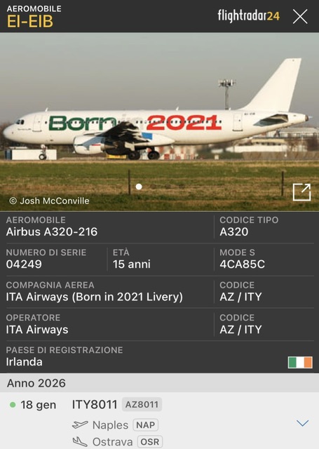Quest’oggi è decollato da Napoli con destinazione Ostrava in Repubblica Ceca , l’Airbus 320-216 EI-EIB con la verniciatura Born in 2021.