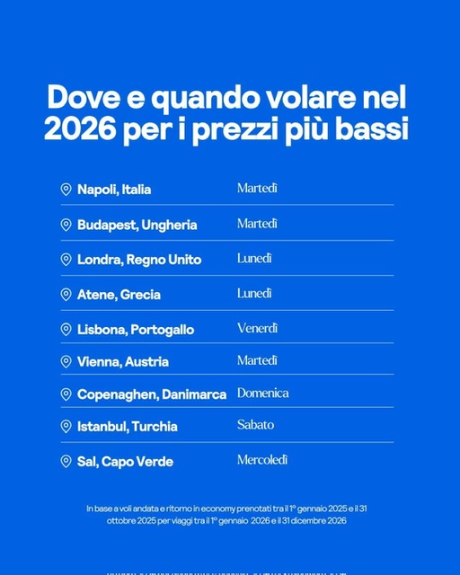 ** Voli economy di andata e ritorno prenotati su Skyscanner tra il 1° gennaio 2025 e il 31 ottobre 2025 per viaggi tra il 1° gennaio 2026 e il 31 dicembre 2026.