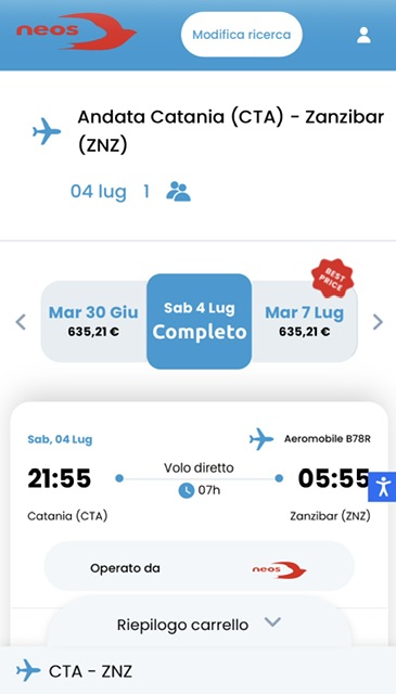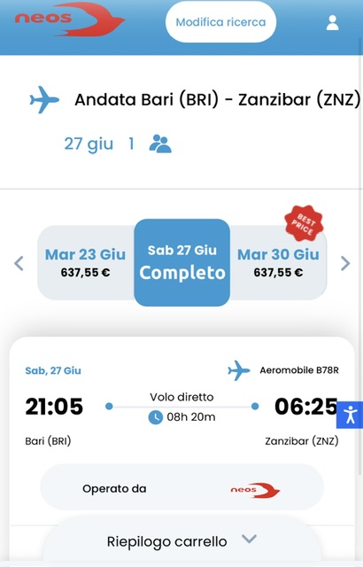 Non sono ancora in vendita sul suo sistema di vendita, ma lo sarà presumibilmente a breve, Neos offrirà un nuovo prodotto regolare su Zanzibar per il Sud Italia in partenza ogni 2 settimane alternativamente da Bari o Catania. Entrambi originano da Roma Fiumicino tra fine giugno a fine ottobre 2026.