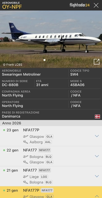 Nella giornata di mercoledi sono giunti questi passeggeri da Glasgow via Liegi con un Swearingen Metroliner 23, l’ultima versione. E’ di North Flying di Aalborg da dove ha volato ieri fino a Glasgow.