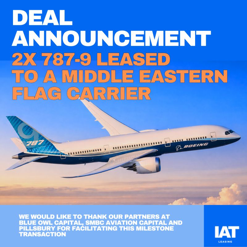 IAT Leasing (“IAT”) è lieta di annunciare l’acquisizione di due (2) Boeing 787-9 del 2017, attualmente in leasing in Medio Oriente. Gli aeromobili sono stati acquisiti per conto di fondi gestiti da Blue Owl Capital. IAT fornirà servizi di gestione continuativa del leasing e di asset management per gli aeromobili.