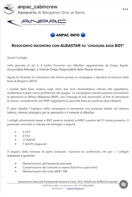 Secondo gli esiti di una riunione avvenuta tra la compagnia aerea Albastar e le organizzazioni sindacali di piloti e assistenti di volo tra poco la base attualmente presente a Bergamo verrà chiusa. Il trasferimento avverrà dal prossimo 31 marzo 2026.