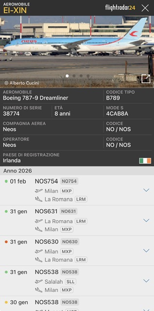 Dopo qualche tempo è rientrato in operazioni regolari il Boeing 787-9 Neos EI-XIN a far data dal 30 gennaio scorso su una Milano Malpensa a Muscat. L’aereo era fermo dal 14 novembre 2025 dopo un ritorno da un volo da Varsavia come NO813. a sua volta era rimasto a terra dal 2 ottobre quando da Milano Malpensa era volato nella capitale come NO801.