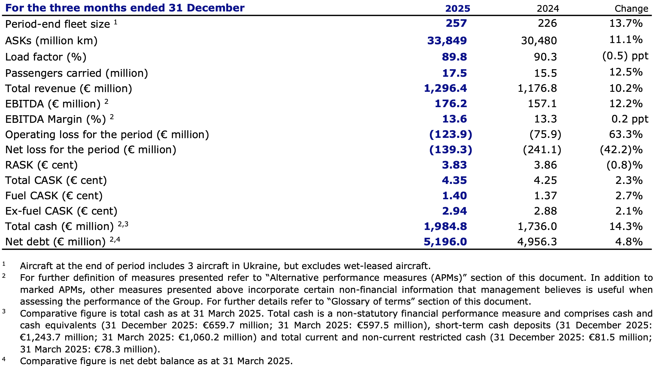 ▶ Il CASK (Ex-fuel Cash) è aumentato del 2,7%, attestandosi a 1,40 centesimi di euro, a seguito dell’aumento del prezzo di mercato, della maggiore spesa per le emissioni e dell’aumento del SAF (Sustainable Aviation Fuel).