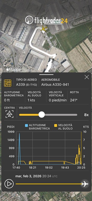 Questa sera, ne abbiamo dato notizia recentemente, l’Airbus 330-900neo ITA Airways con le marche EI-TYG e’ uscito dall’hangar ed e’ stato poi trainato alla piazzola prova motori, come di vede nell’immagine all’incirca alle 21:30.