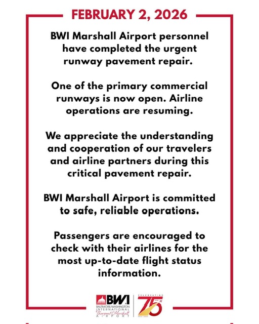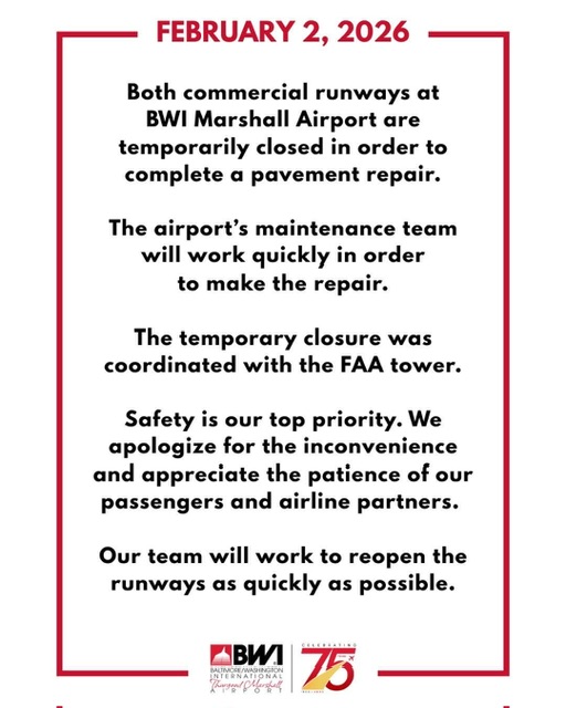 Nella giornata di ieri all’aeroporto americano di Baltimora sono state riscontrate problematiche alle condizioni del manto di usura frammentato in alcune porzioni, tanto da dover bloccare le attività per qualche ora nel pomeriggio. Poi dopo le riparazioni ha riaperto, ma diversi voli sono stati dirottati o cancellati.