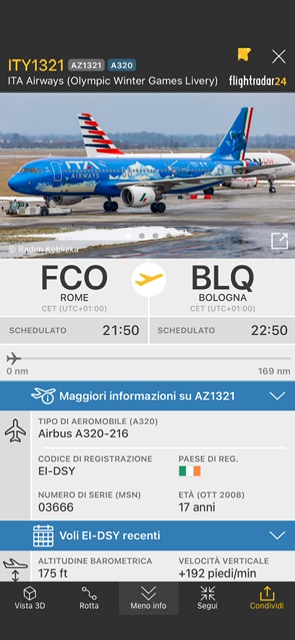Lo special color di ITA Airways per i Winter games Milano Cortina 2026 , l’A320-216 EI-DSY oggi e’ partito stamani da Lamezia Terme per Roma e poi come AZ108 andrà ad Amsterdam e poi ritornerà a Roma Fiumicino come AZ107.