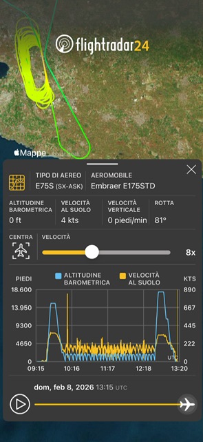 L’aereo e’ decollato alle 10:33 ed e’ arrivato nell’area di Taranto alle 11:04 e ha iniziato ad effettuare la sua attività addestrativa effettuando in sequenza 28 circuiti di avvicinamento con annesse riattaccate. Alle 13:38 e’ poi rientrato a Foggia. L’atterraggio e’ avvenuto alle 14:15.