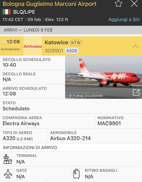 Quest’oggi la Air Arabia fará ACMI con Electra Airways / Air001 con un Airbus 320-200 LZ-EAE che giungerá a Bologna da Katowice come 3O9901 poco dopo le 13.