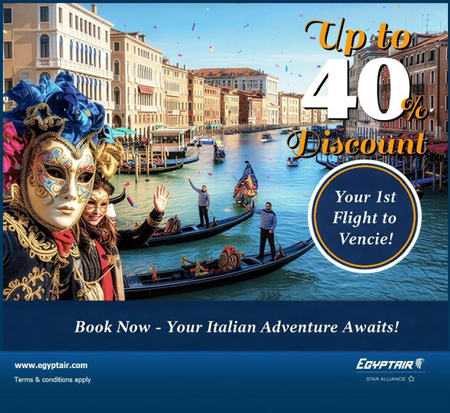 Tra qualche mese decollerá il nuovo volo Egyptair tra Cairo e Venezia e la compagnia aerea di bandiera egiziana ha in questo momento in atto alcune iniziative di promozione commerciale e qui annuncia uno sconto del 40%.