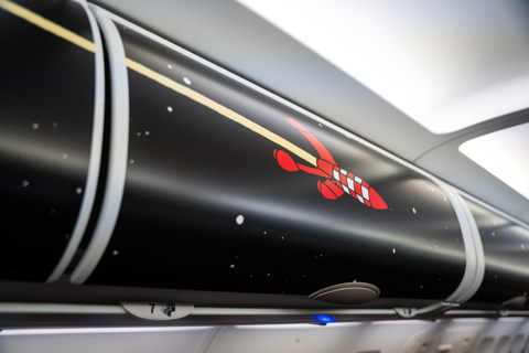 All’interno della cabina, l’icona belga L’esperienza continua, dove l’atmosfera lunare si estende attraverso vari elementi di design. Le cappelliere raccontano una storia con una sequenza di immagini che si susseguono come vignette di fumetti: il razzo che decolla dalla Terra, il rischio di incontrare un asteroide… Il tutto incorniciato dalla citazione scritta a mano da Hergé: “Credendo nei suoi sogni abbastanza a lungo, l’uomo li trasforma in realtà”1.
