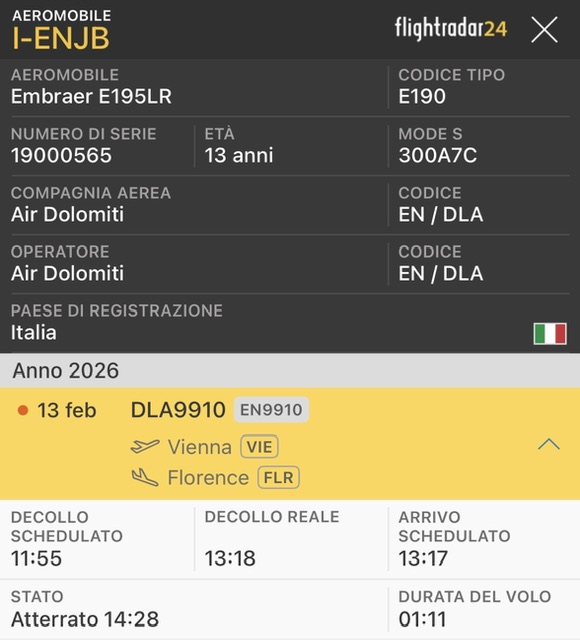 Quest’oggi il volo E195 con le marche I-ENJB e’ partito alle 13:18 da Vienna come EN9910, l’atterraggio a Firenze e’ stato alle 14:28.
