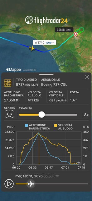 Il velivolo basato a Lagos era partito per Port Hancourt, un importante centro per l’industria petrolifera.Il volo ARA740 era decollato alle 7:24 e alle 7:40 era a FL276, quindi ha iniziato l’immediata discesa verso Benin alle 8:05. Nessun problema per i passeggeri a bordo. Certamente piu’ d’uno si e’ spaventato.