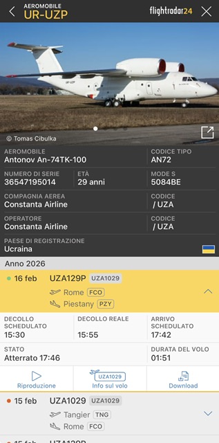 Successivamente, a metà pomeriggio di ieri e’ partito da Roma Fiumicino alle 15:55 per Piestany come UZA1029. L’aeroporto slovacco è dove l’aeromobile e’ basato.