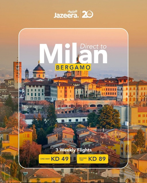 Tra il 2 agosto e il 6 settembre 2026 i voli settimanali della Jazeera Airways tra Kuwait City e Bergamo diventano quattro alla settimana.