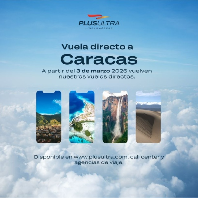Dal 1° aprile, la compagnia aerea spagnola opererà tre frequenze settimanali tra Madrid e Caracas – martedì, giovedì e sabato – aggiungendo un volo settimanale aggiuntivo da Tenerife la domenica. A partire da luglio, Plus Ultra aumenterà il suo servizio per Caracas a cinque voli a settimana: quattro da Madrid – lunedì, martedì, giovedì e sabato – più la frequenza settimanale da Tenerife.